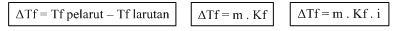 III. PENURUNAN TITIK BEKU (ΔTf) Keterangan : ΔTf : penurunan titik beku Kf : konstanta penurunan titik beku molal pelarut m : molalitas zat terlarut Tf air = 0oC i : faktor Van’t Hoff