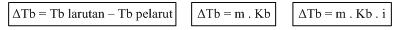 Keterangan : ΔTb : kenaikan titik didih Kb : konstanta kenaikan titik didih molal pelarut m : molalitas zat terlarut Tb air = 100oC i : faktor Van’t Hoff